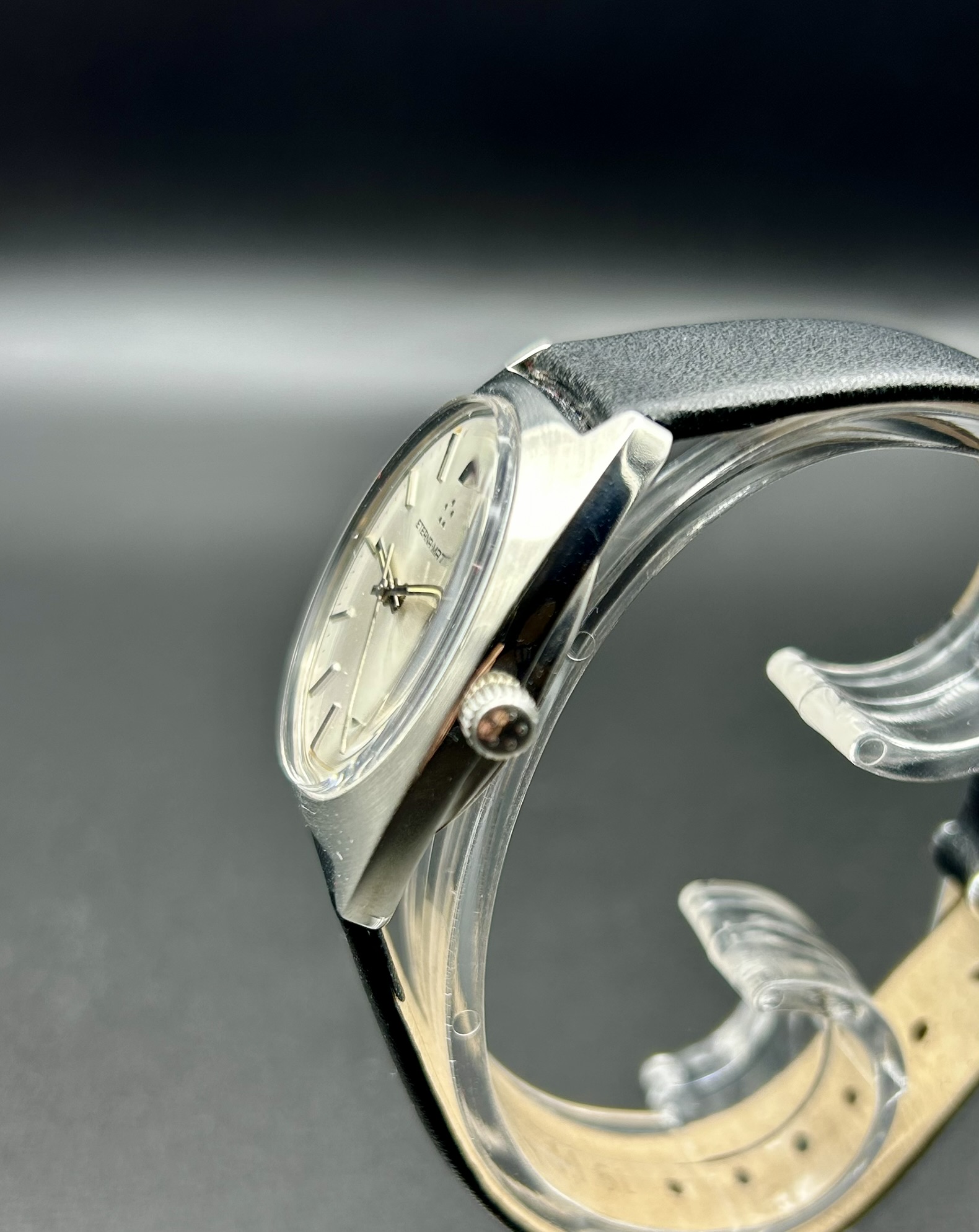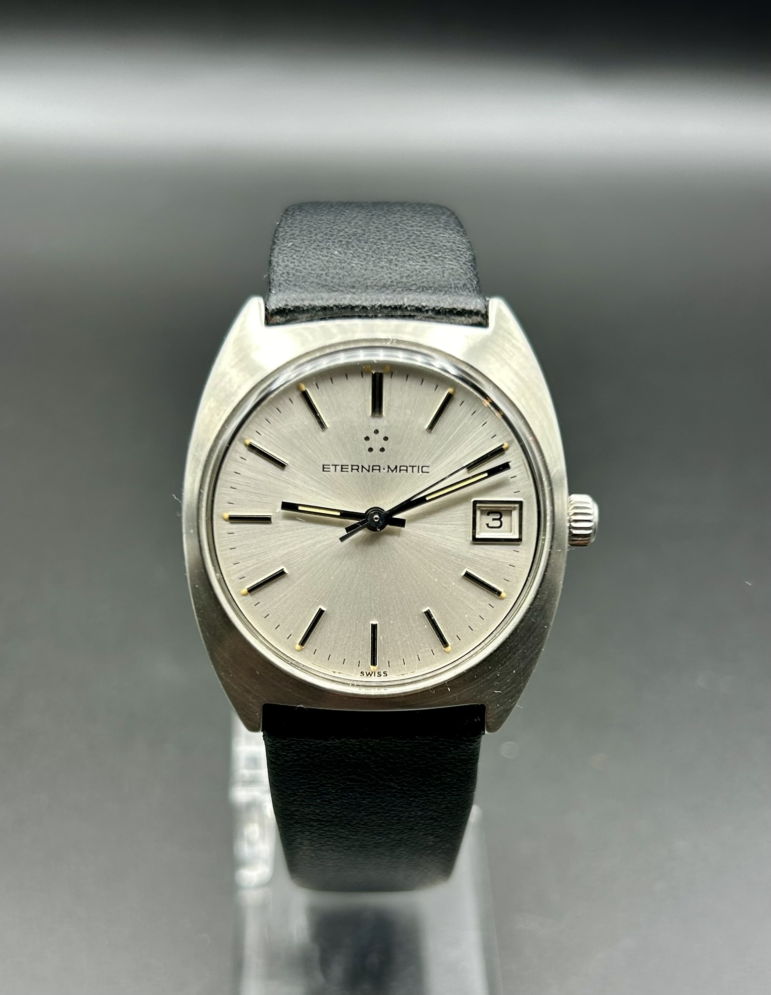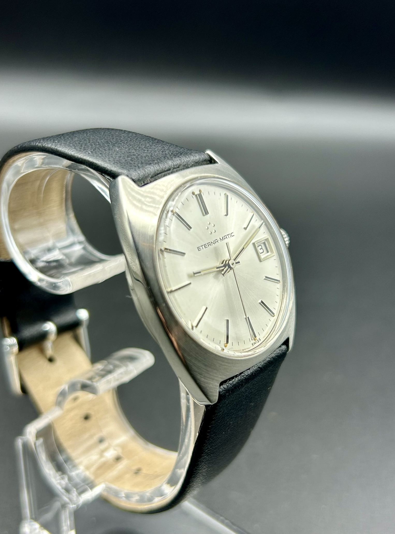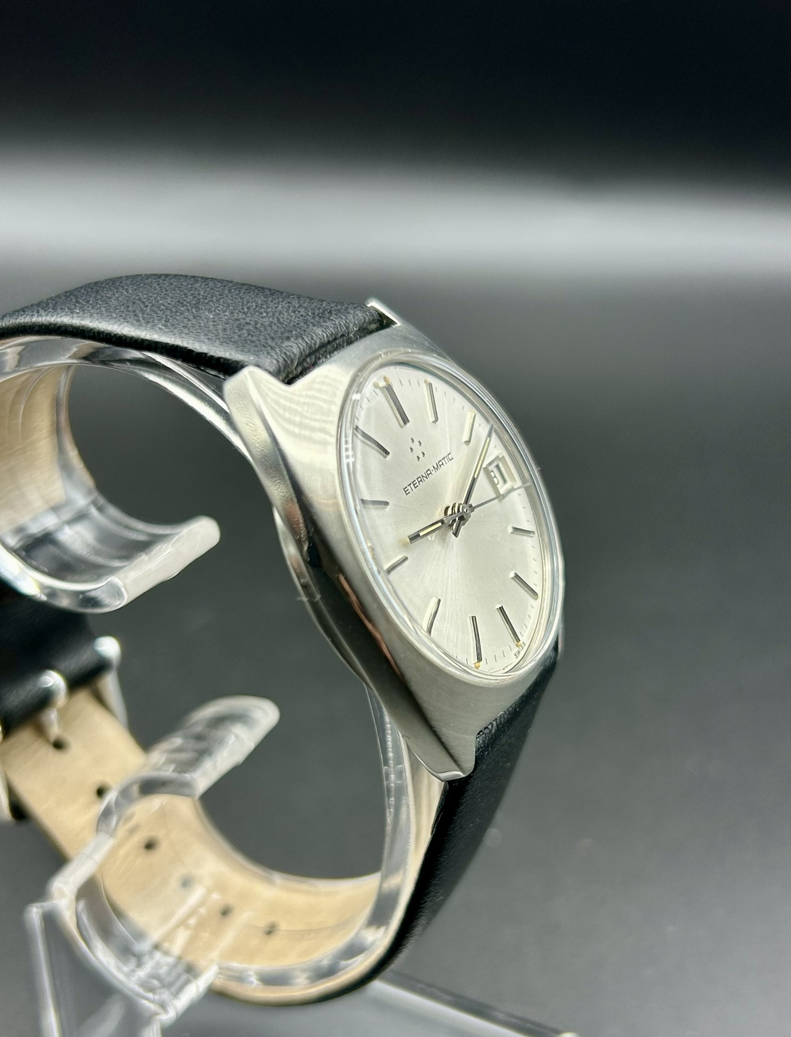 Diese elegante Eterna-Matic ist ein klassischer Vertreter schweizerischer Uhrmacherkunst der 1960er/70er-Jahre. Das Modell verbindet ein minimalistisches Zifferblatt mit klaren Linien und der für Eterna typischen hochwertigen Automatiktechnologie. Besonders charakteristisch ist das Logo aus fünf Punkten, das für die berühmte Kugellager-Rotor-Innovation steht – eine technische Revolution, die Eterna in den 1940ern einführte und die automatische Armbanduhren dauerhaft zuverlässiger und robuster machte.
